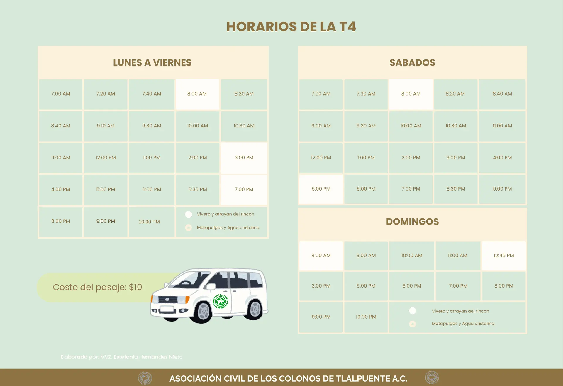 Tlalpuente ofrece un servicio de transporte interno con dos rutas: una que recorre la zona del Vivero y Arrayán del Rincón, y otra que pasa por Matapulgas y Agua Cristalina. El costo general del pasaje es de $10 por persona.